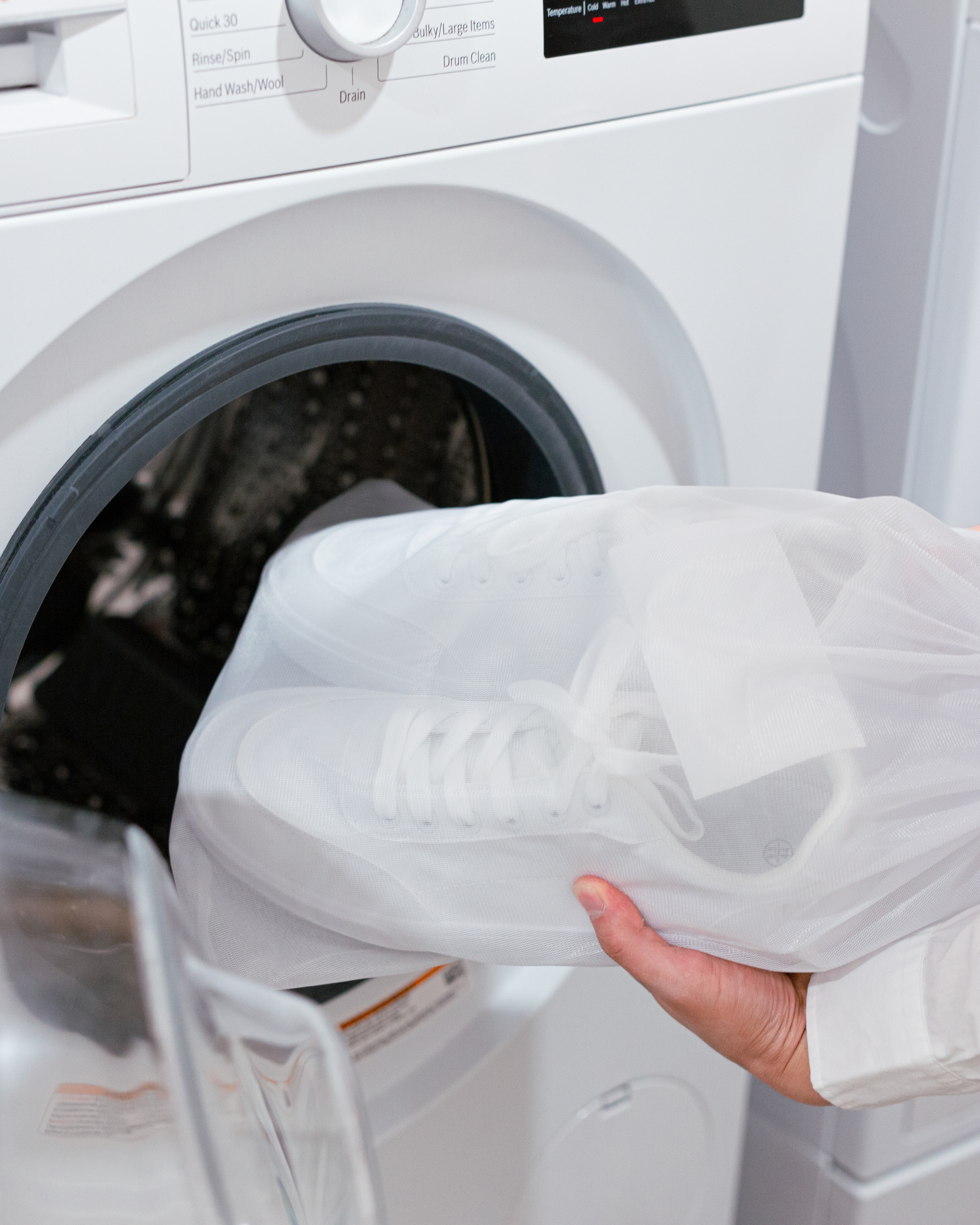 Place the sealed shoe bag with the detergent sheet into the washer and set it to a gentle cycle with cold water.